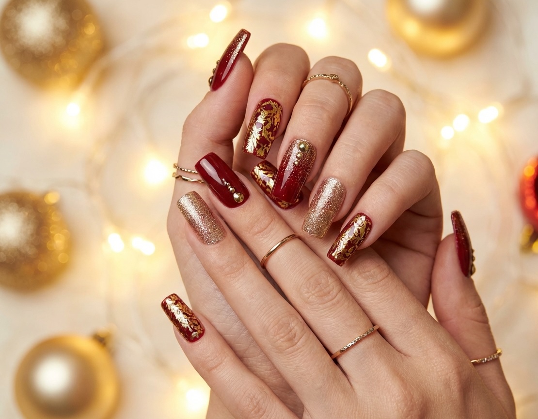 Стразы и декоративные элементы добавляют праздничного блеска. На квадратных ногтях кристаллы можно выложить по прямой линии у основания или создать геометрический узор. Золотистые стразы сочетаются с красным и бордовым покрытием, создавая роскошную композицию.